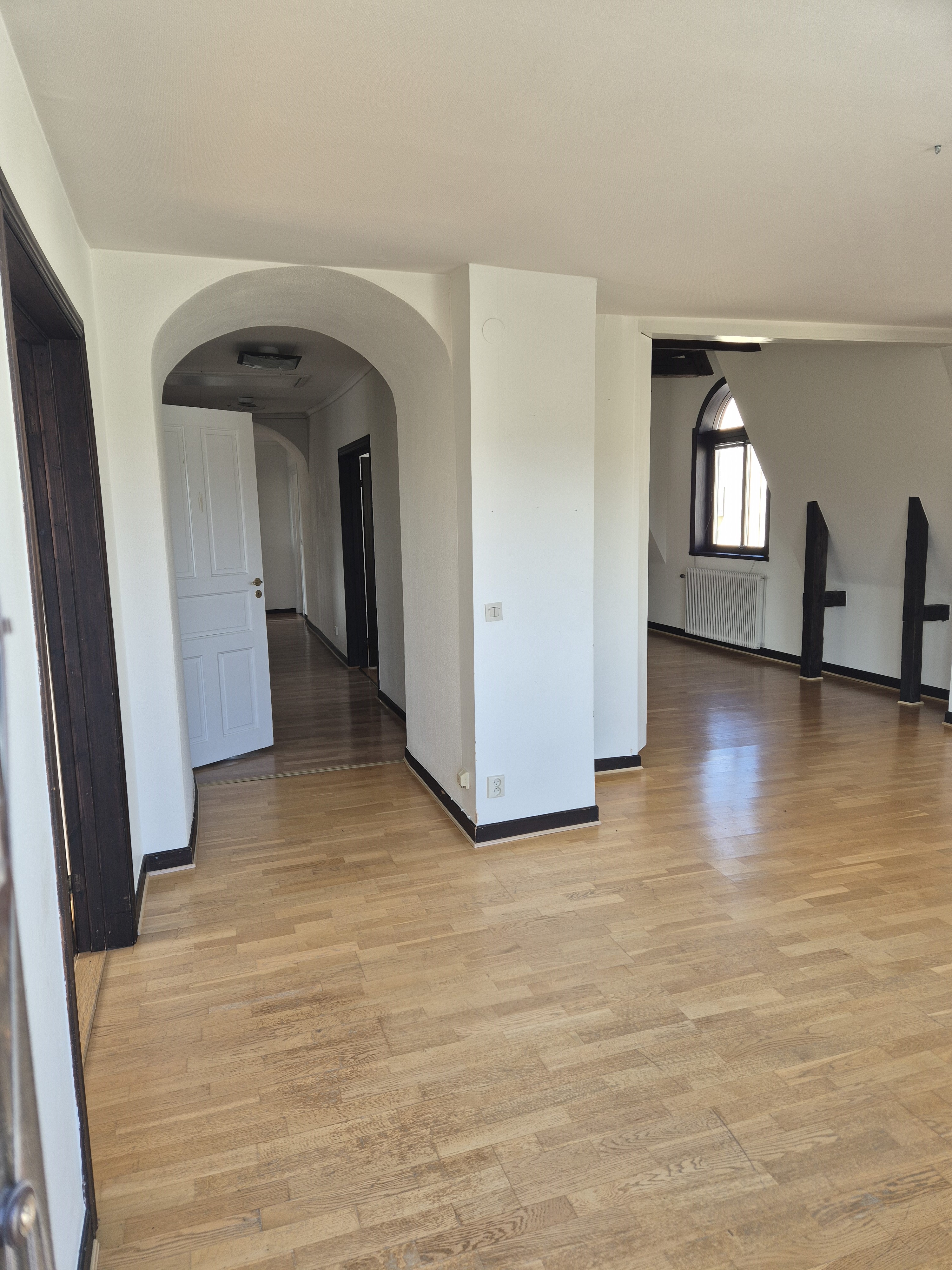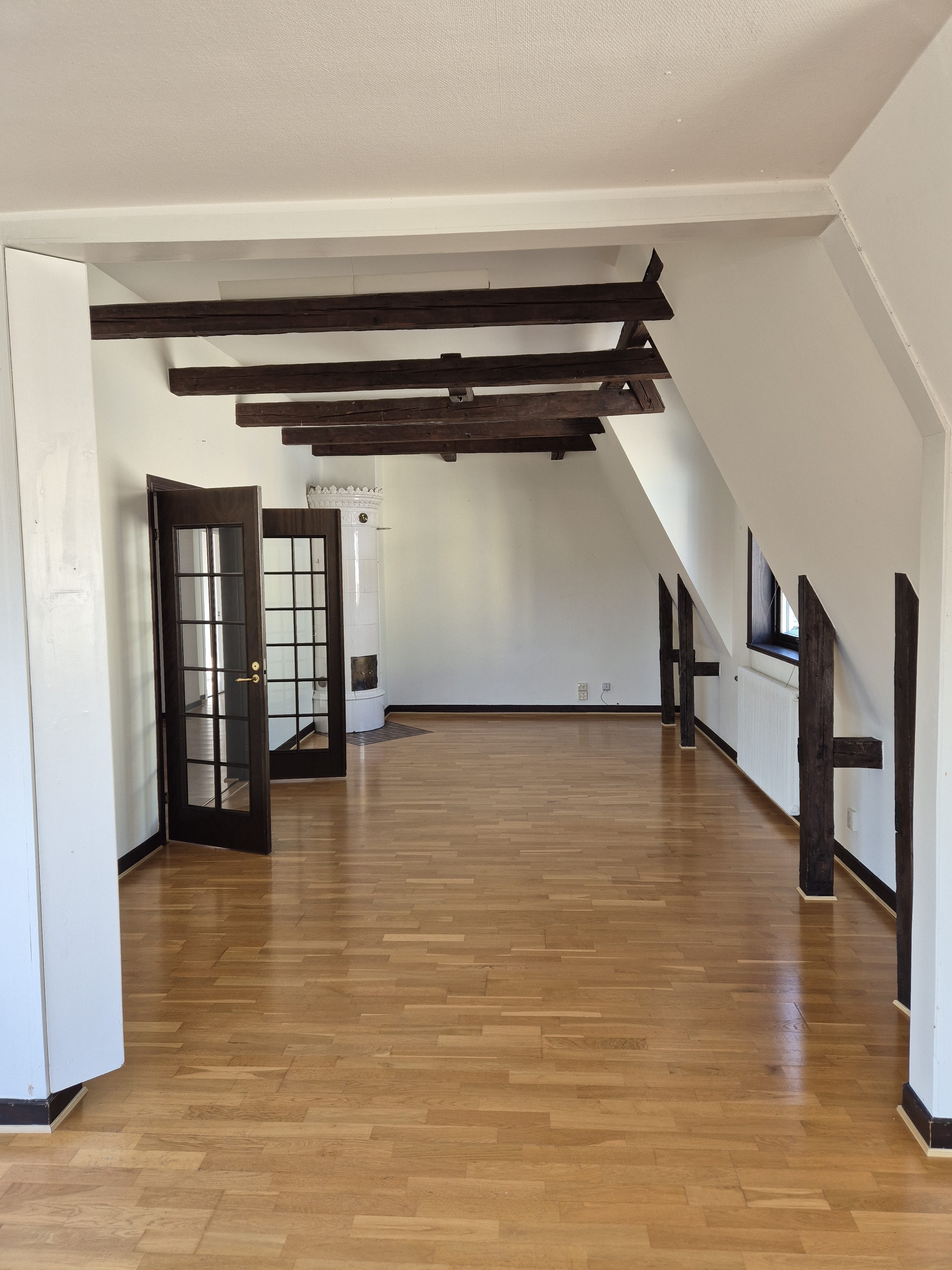 Lägenheten bjuder på en unik och charmig atmosfär med sina imponerande takbalkar och den vackra, äldre kakelugnen i vardagsrummet (ej i bruk), som ger rummet en tidlös karaktär. De generösa rumsytorna skapar en härlig känsla av rymd, och de stora fönstren släpper in ett fantastiskt naturligt ljus som förstärker bostadens varma och välkomnande känsla.