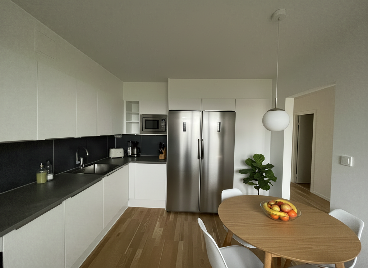 Köket kommer att utrustas med vita skåpluckor, mörk bänkskiva och rostfria vitvaror såsom kyl/frys, spishäll och diskmaskin. Badrummet blir helkaklat och får duschdörrar samt tvättmaskin och torktumlare, plus extra WC. Här får du njuta av både modern komfort och stil i ett charmigt hem!