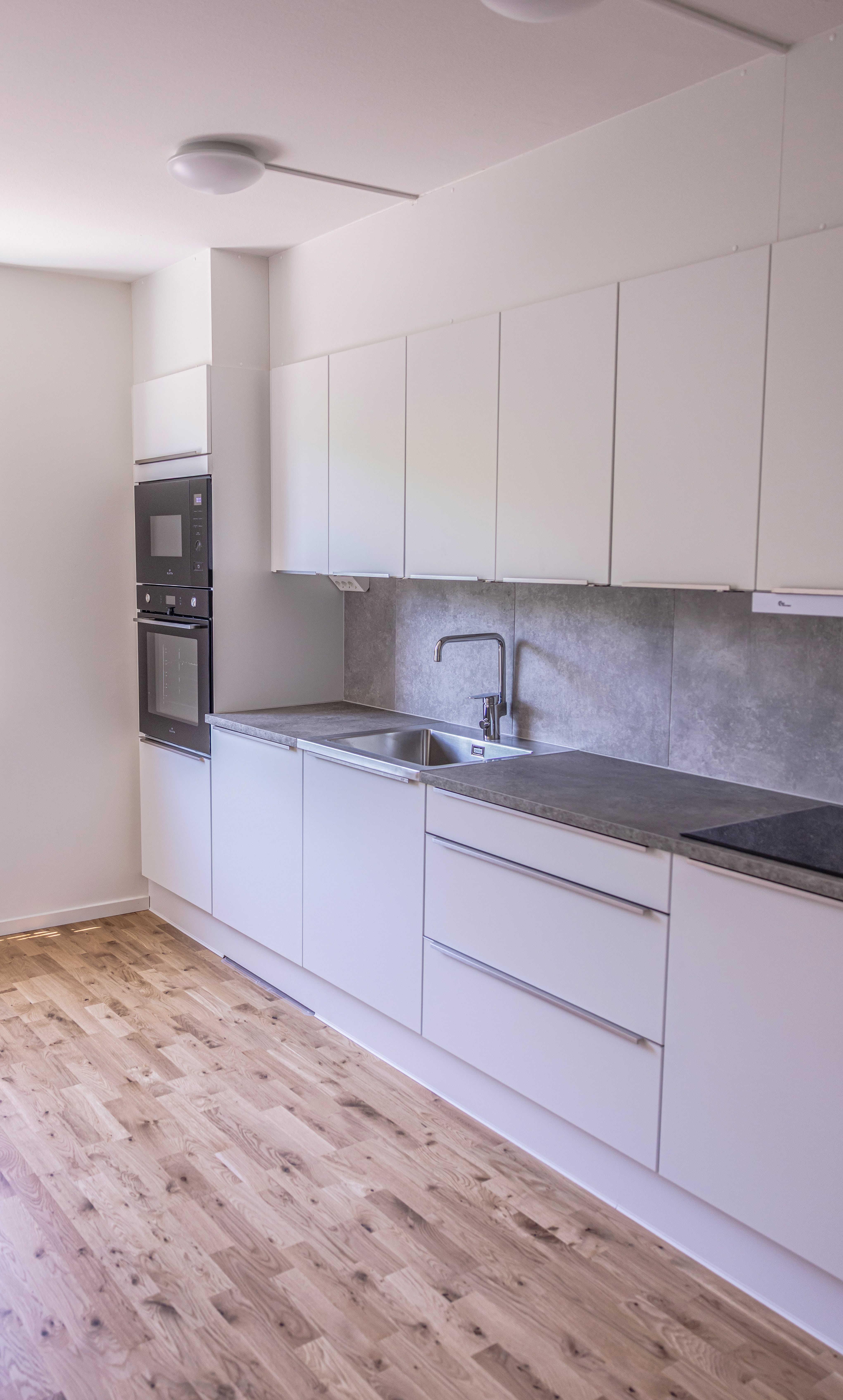 Köket kommer att ha vita luckor, mörk bänkskiva och rostfria vitvaror: kyl/frys, spishäll, diskmaskin. Badrummet är helkaklat med duschdörrar med tvätt/torktumlare.