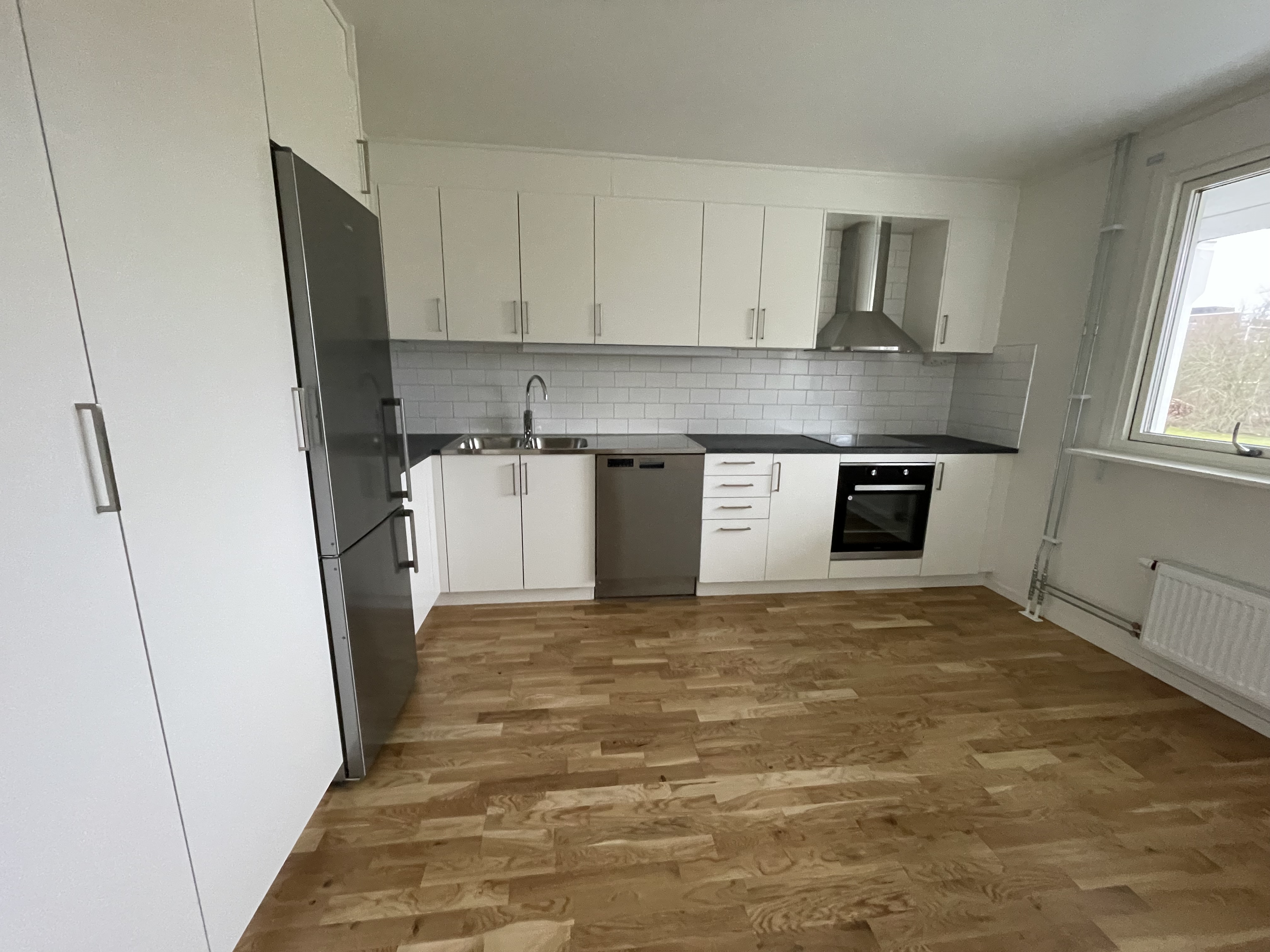 Köket har vita luckor, mörk bänkskiva och rostfria vitvaror: kyl/frys, spishäll, diskmaskin. Badrummet är helkaklat med duschdörrar med tvätt/torktumlare.