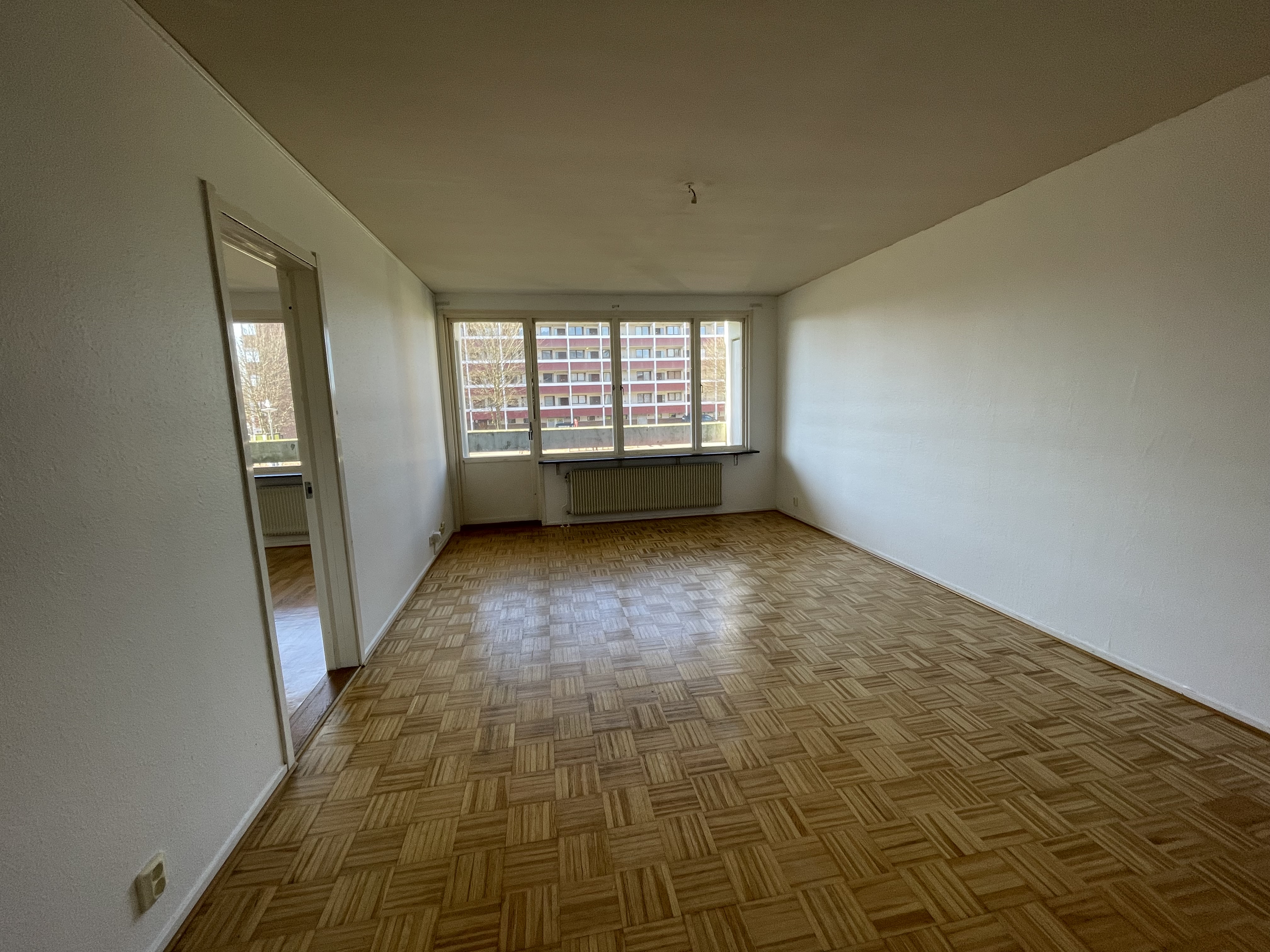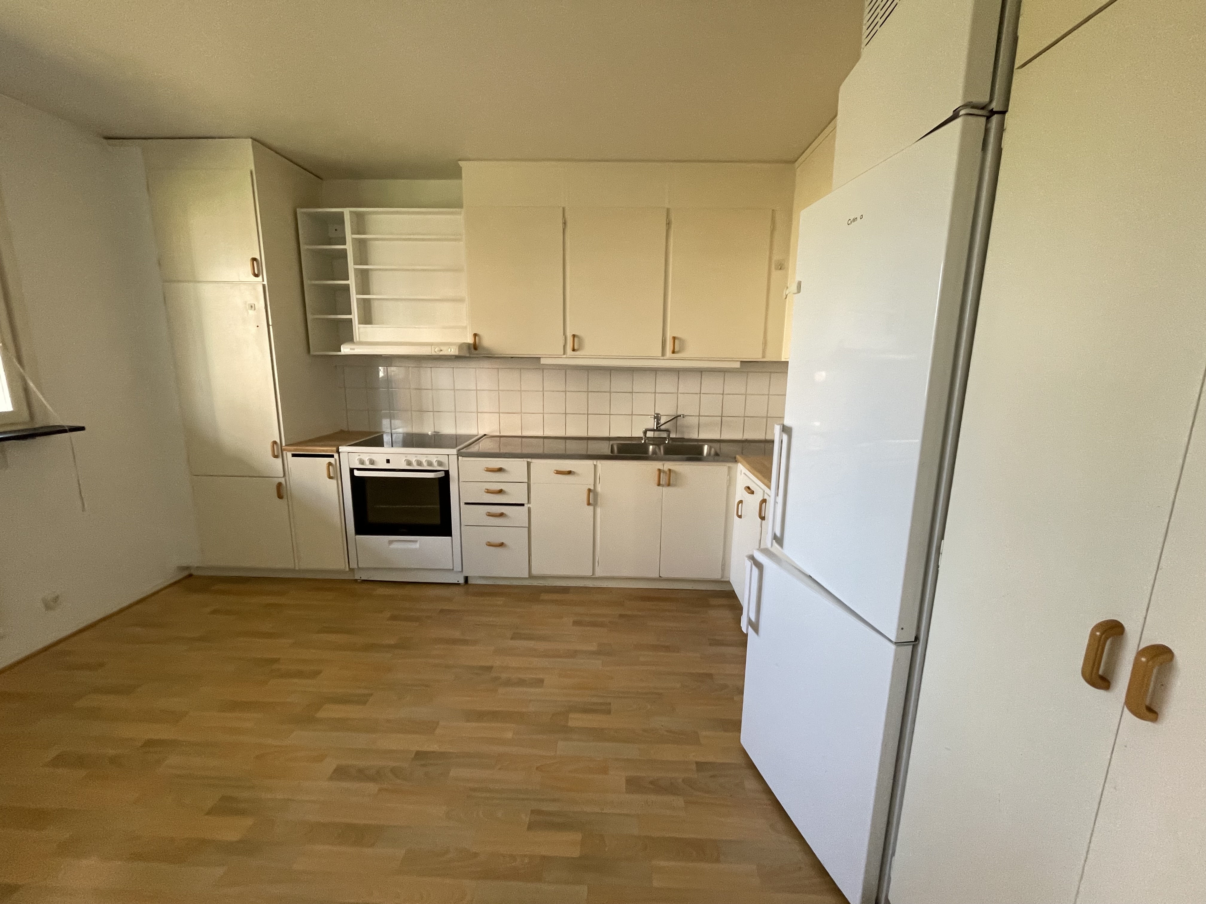 Lägenheten har parkettgolv och vita väggar. Köket har vita luckor, vita bänkskiva och kyl/frys, spishäll. Badrummet är helkaklat med badkar.