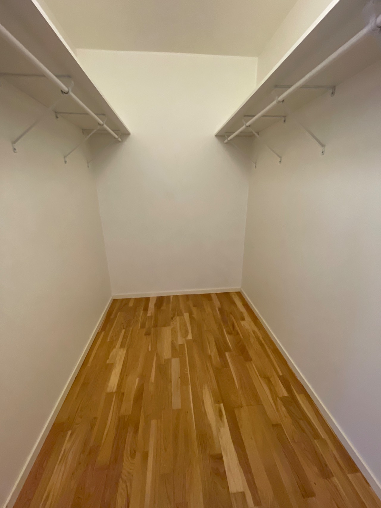 Lägenheten har parkettgolv och vita väggar.