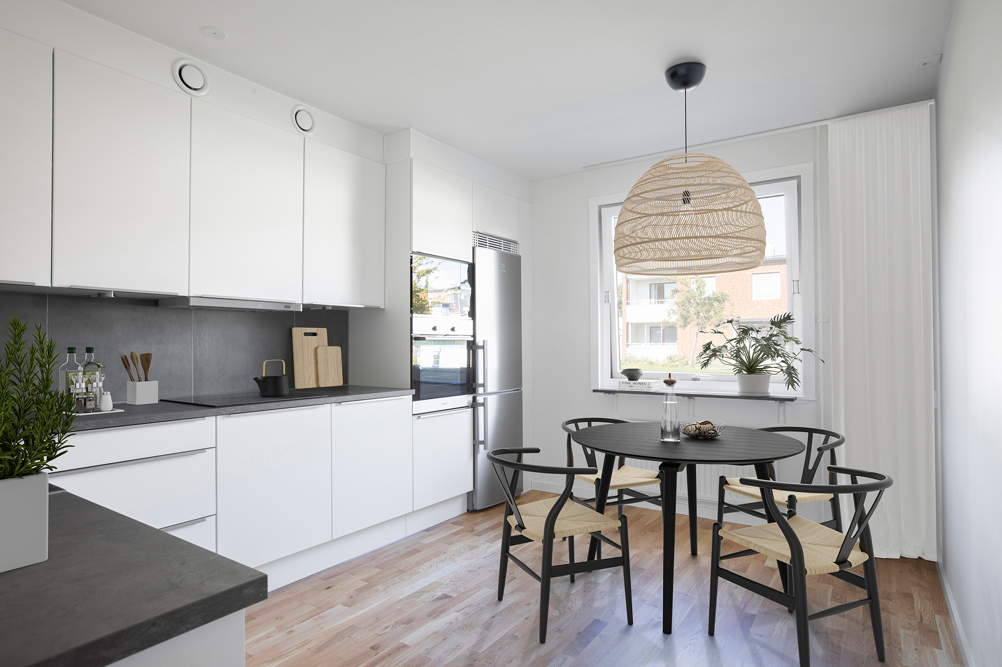 Köket är inrett med: vit skåpinredning och grå bänkskiva och rostfria vitvaror.