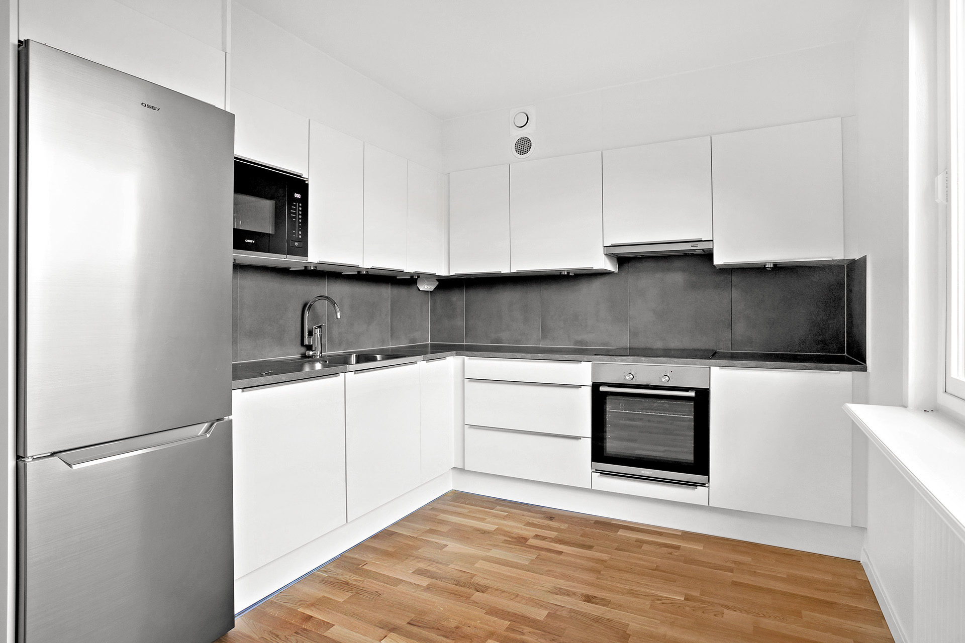 Lägenheten renoverades 2025 och har parkettgolv samt vita släta väggar i hela lägenheten.