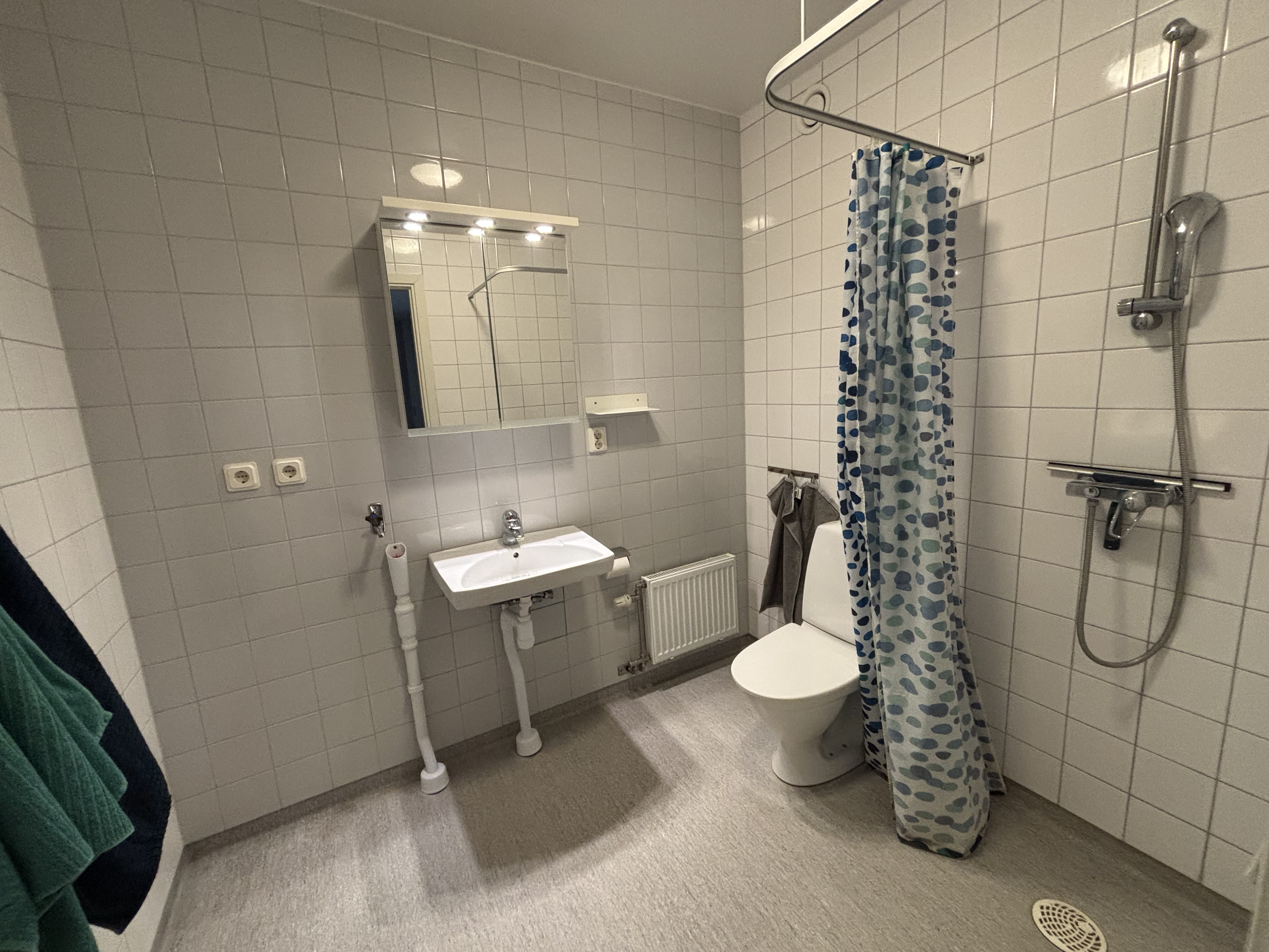 Kök med öppen planlösning. Badrummet är stilrent med dusch samt kakel på väggar och ljus våtrumsmatta på golvet.