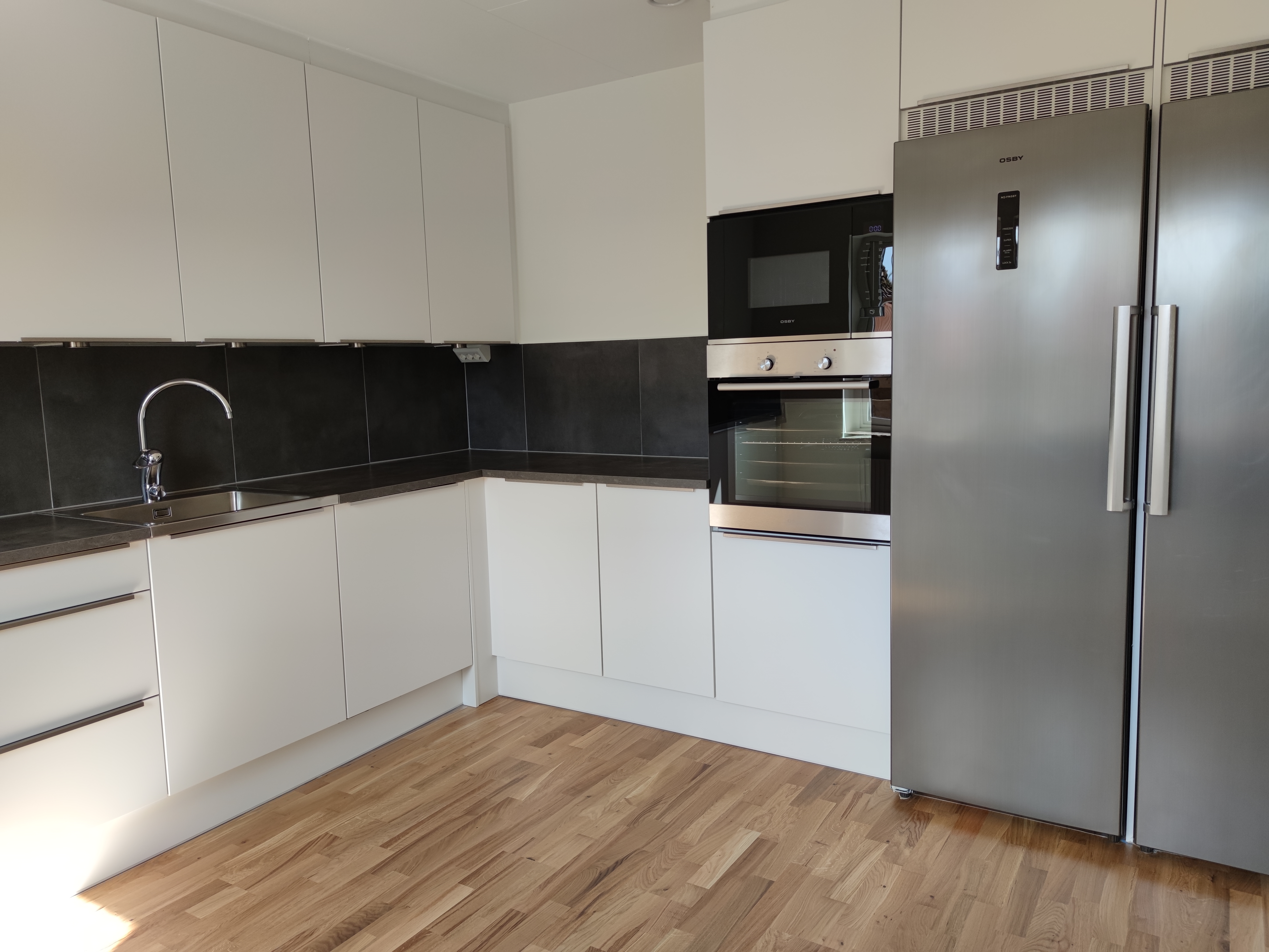 Köksinrednignen går i stilrent vitt med en bänkskiva och stänkskydd i antracitgrå ton och är utrustat med spishäll, inbyggd mikro, diskmaskin samt hel kyl och frys.