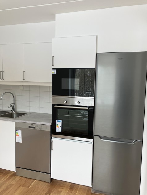 Lägenheten har genomgående hög och modern standard. I hallen finns klinkergolv i grå nyans, säkerhetsdörr. Köket har vita luckor, rostfria handtag, grå bänkskiva och är utrustad med kyl/frys, diskmaskin, fläkt, induktionshäll, inbyggd varmluftsugn och inbyggd mikro i rostfritt stål. Genomgående parkett i alla rum, vitmålade väggar. Helkaklat badrum med elburen golvvärme, duschvägg och handdukstork. En garderob per sovrum.