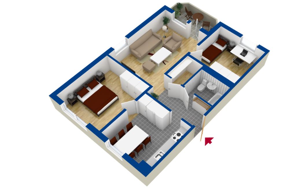 Hallen har parkettgolv, samt tapet. Köket har ljusgrå luckor, rostfria handtag, vitt kakel,spishäll samt plats för diskmaskin. Badrummet har badkar, grå matta och vitt kakel på väggarna. Parkettgolv i vardagsrum med ljusa tapeter samt utgång till uteplatsen som är mot grönområde. Båda sovrummen har matta samt tapeter.