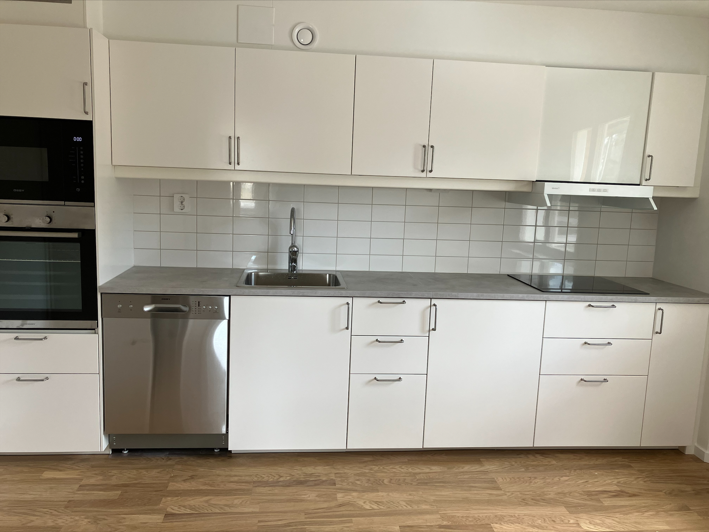 Lägenheten har genomgående hög och modern standard. I hallen finns klinkergolv i grå nyans, säkerhetsdörr. Köket har vita luckor, rostfria handtag, grå bänkskiva och är utrustad med kyl/frys, diskmaskin, fläkt, spishäll, inbyggd varmluftsugn och inbyggd mikro i rostfritt stål. Genomgående parkett i alla rum, vitmålade väggar. Helkaklat badrum med elburen golvvärme, handdukstork, tvättmaskin och torktumlare. En garderob per sovrum.