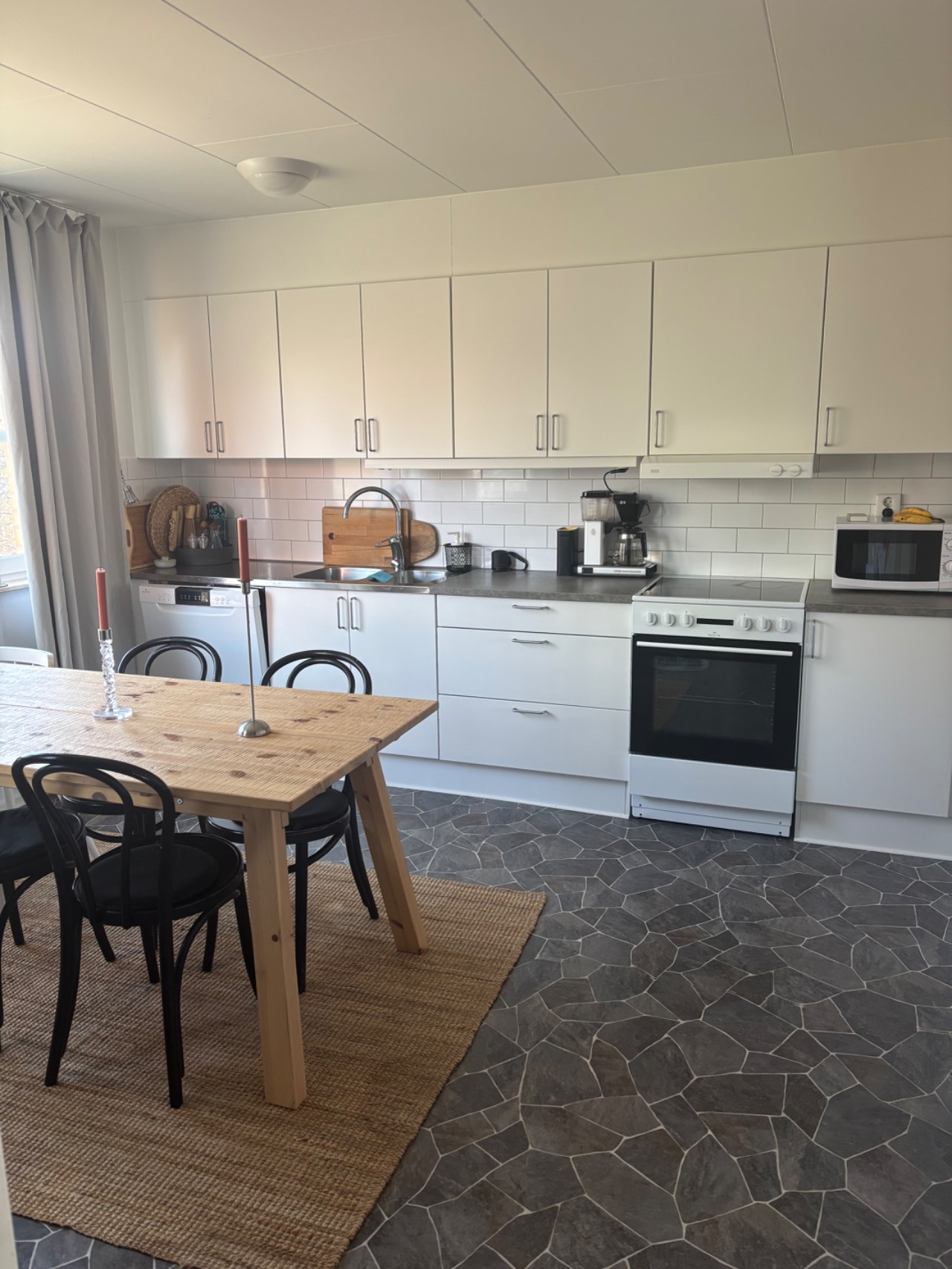 Välkommen till en ljus och välplanerad lägenhet med stilrena materialval. Köket är modernt och går i vitt med vitt kakel som stänkskydd och en bänkskiva i antracitgrå ton utrustat med diskmaskin och hel kyl och frys.