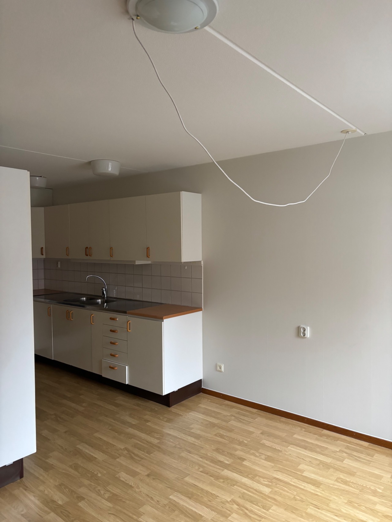 Lägenheten har genomgående vita väggar och plastmatta.