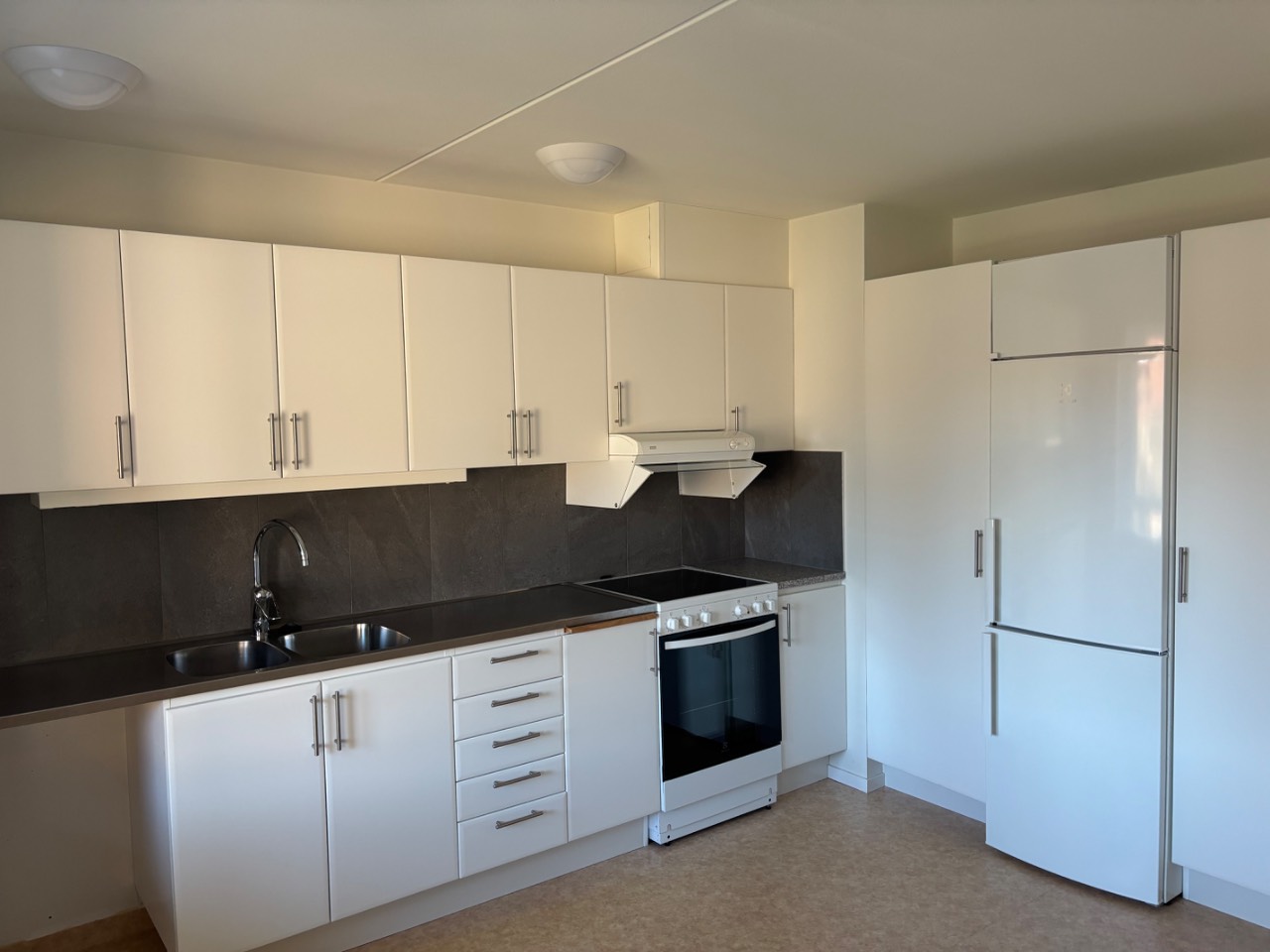 Köket har vit köksinredning med bänkskiva i grått/rostfritt samt stänkskydd i antracitgrått. Köket är utrustat med diskmaskin.