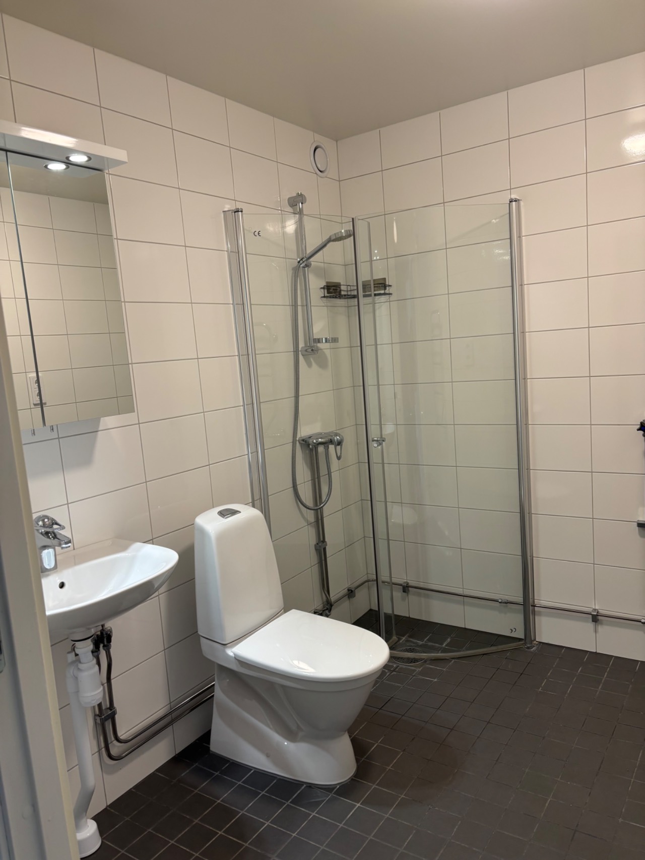 Badrummet är helkaklat med vita kakelväggar och grå klinker på golvet. Här finns dusch med glasväggar samt elektrisk handdukstork.