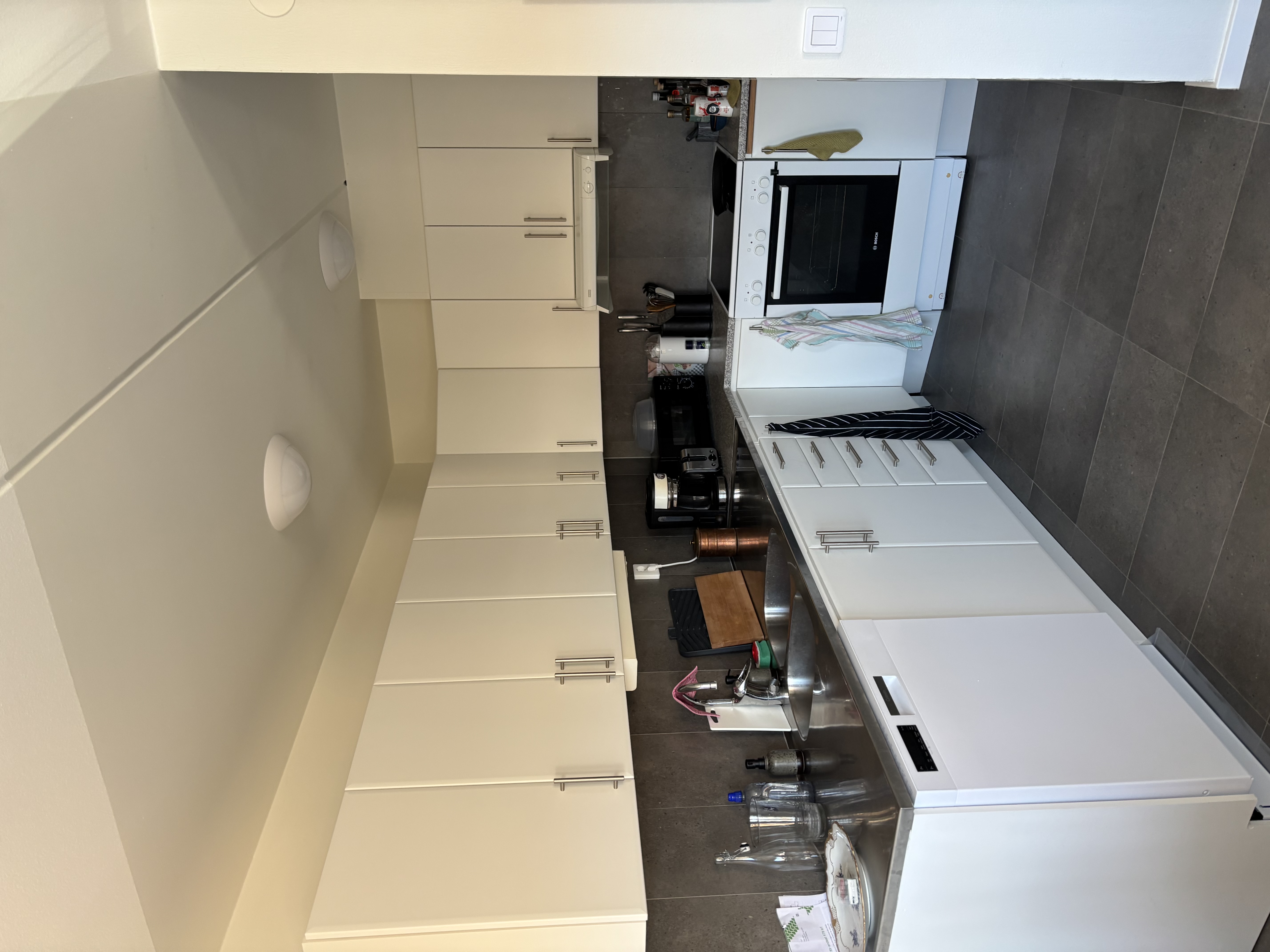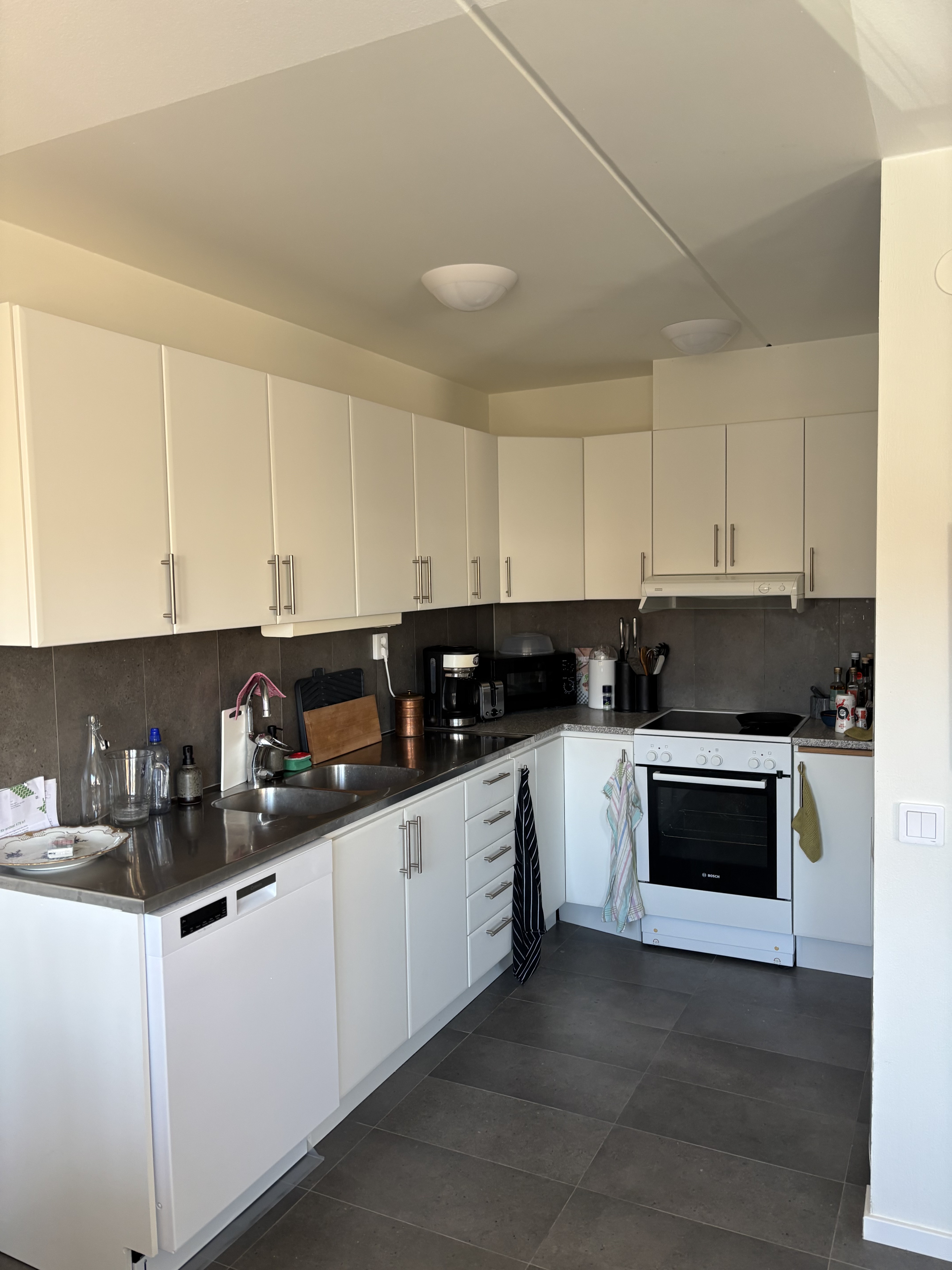 Bostaden erbjuder en öppen planlösning mellan kök och vardagsrum. Köket är stilrent inrett i vitt och utrustat med diskmaskin. På golvet ligger en praktisk grå klinker som både är snyggt och lättskött.
