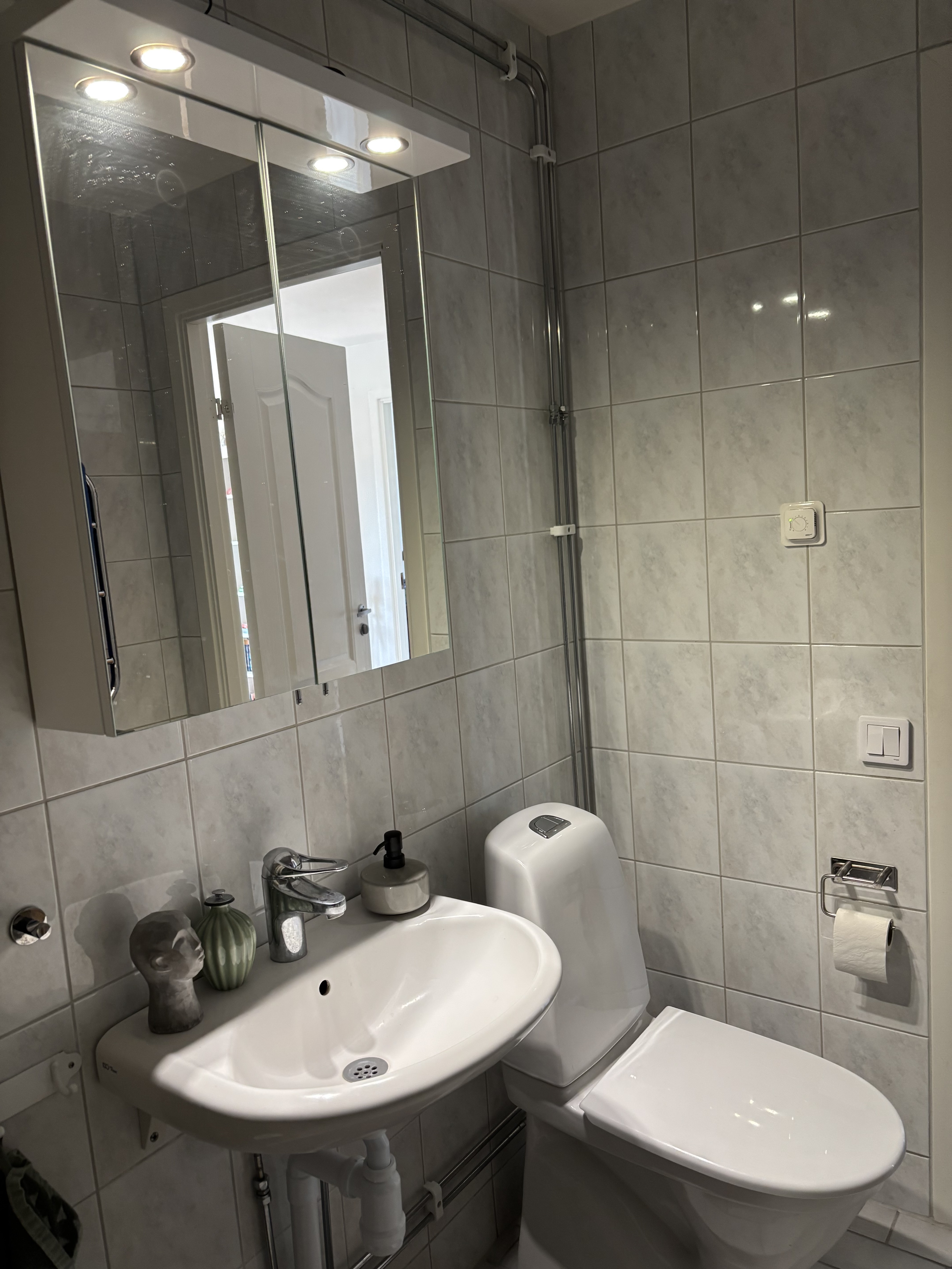 Det helkaklade badrummet är fräscht och funktionellt samt utrustat med en egen tvättpelare för extra bekvämlighet.