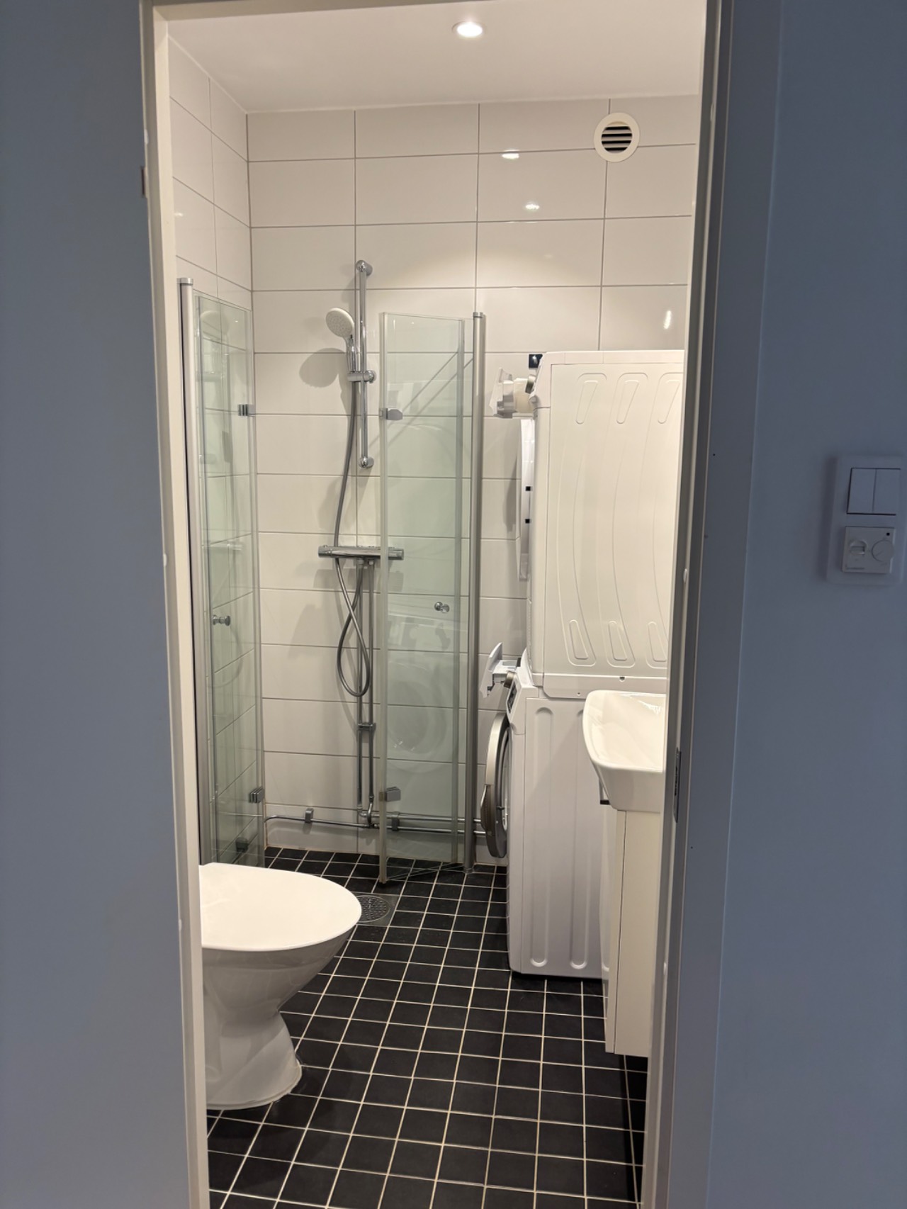 Badrummet har kakel, klinker, kombimaskin samt dusch. Fönster finns i badrummet.