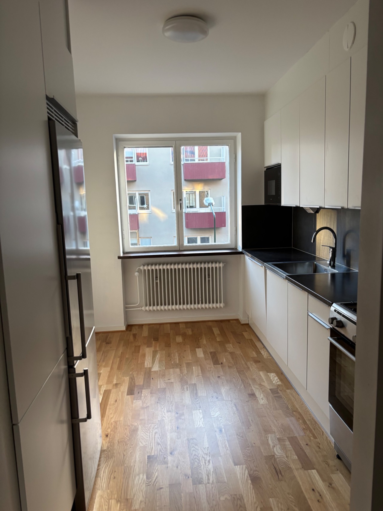Köket är inrett i stilrent vitt med antracitgrå köksbänk samt stänktskydd och är bekvämt utrustat med inbyggnadsmicro och diskmaskin. Här finns gas-spis (hyresgäst har eget gasavtal)