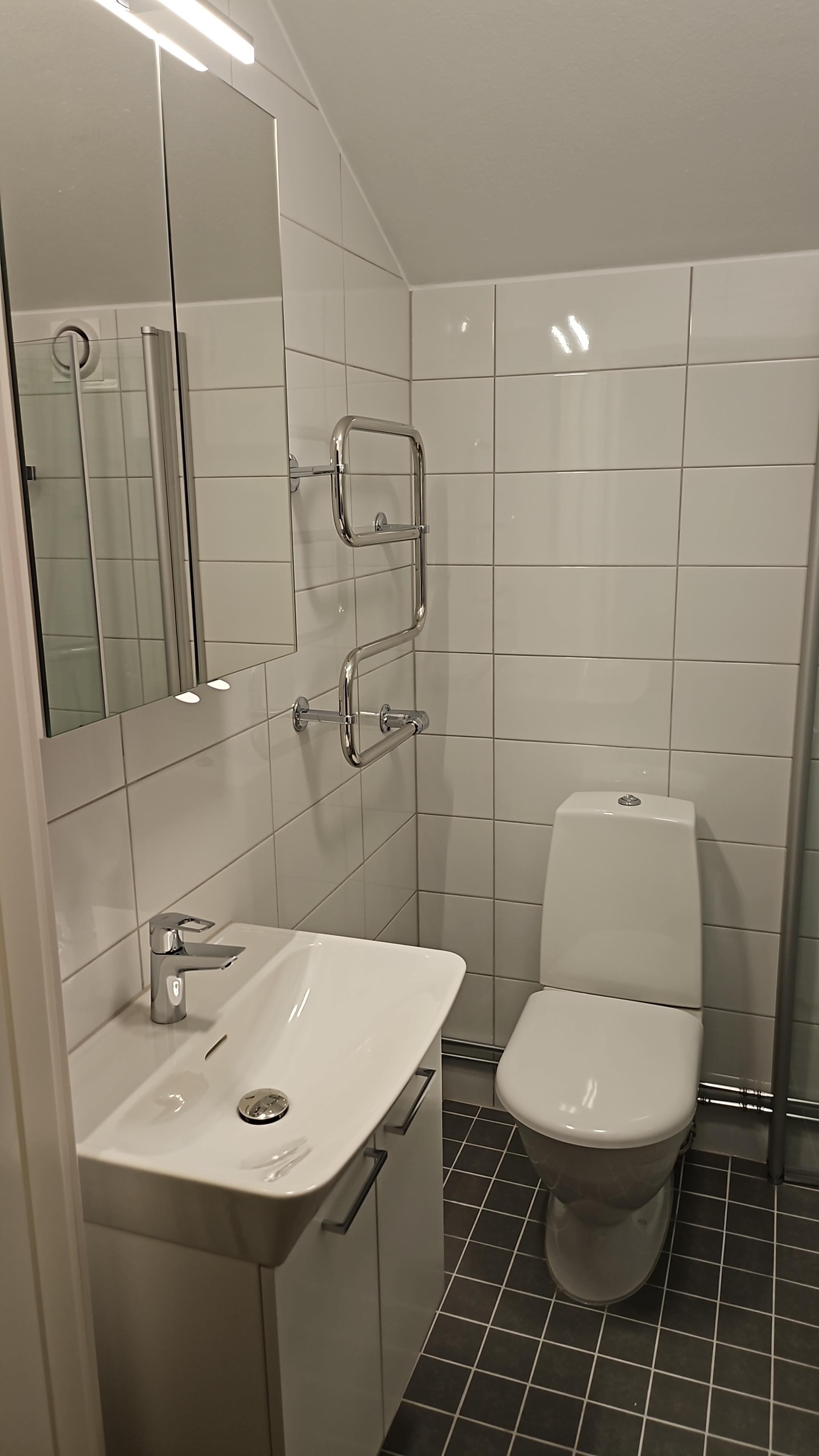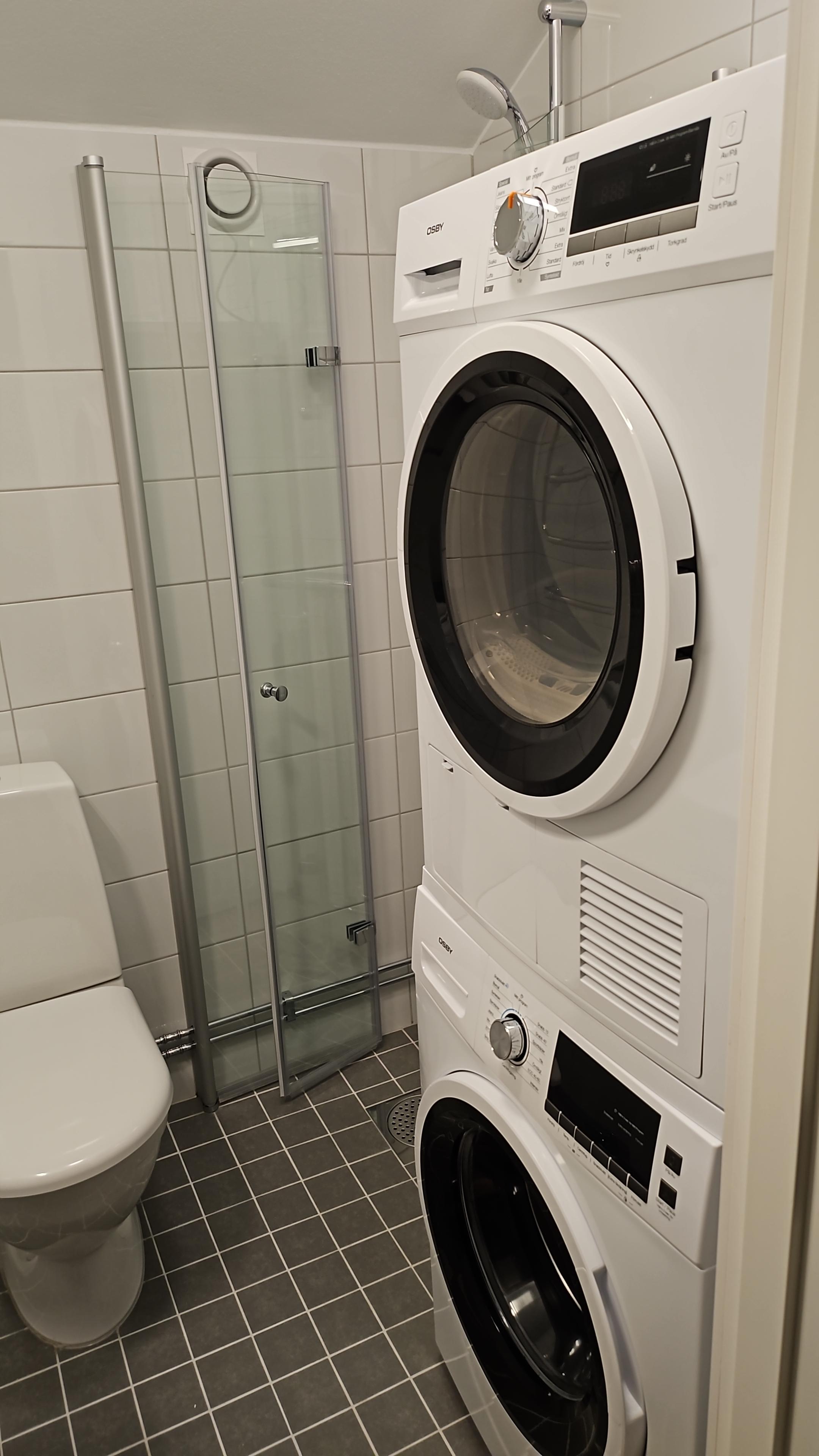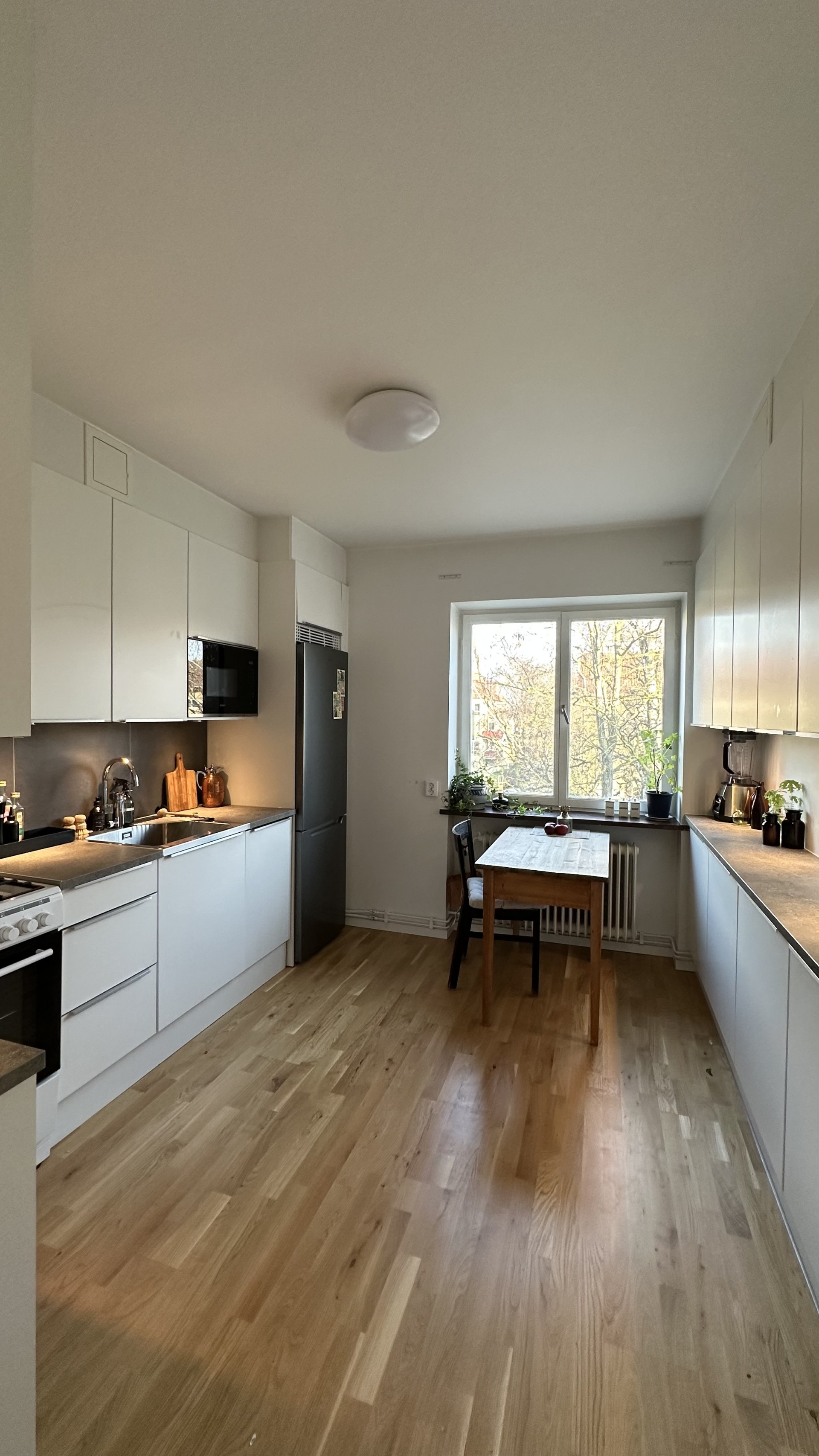 Köket är inrett i stilrent vitt, med antracitgrå bänkskiva och stänkskydd. I köket finns det gas-spis.  Badrummet och gäst wc är helkaklat i vitt med grå klinker. Lägenheten är utrustad med bekvämligheter så som diskmaskin, mikrovågsugn, hel kyl och frys, tvättmaskin och torktumlare.